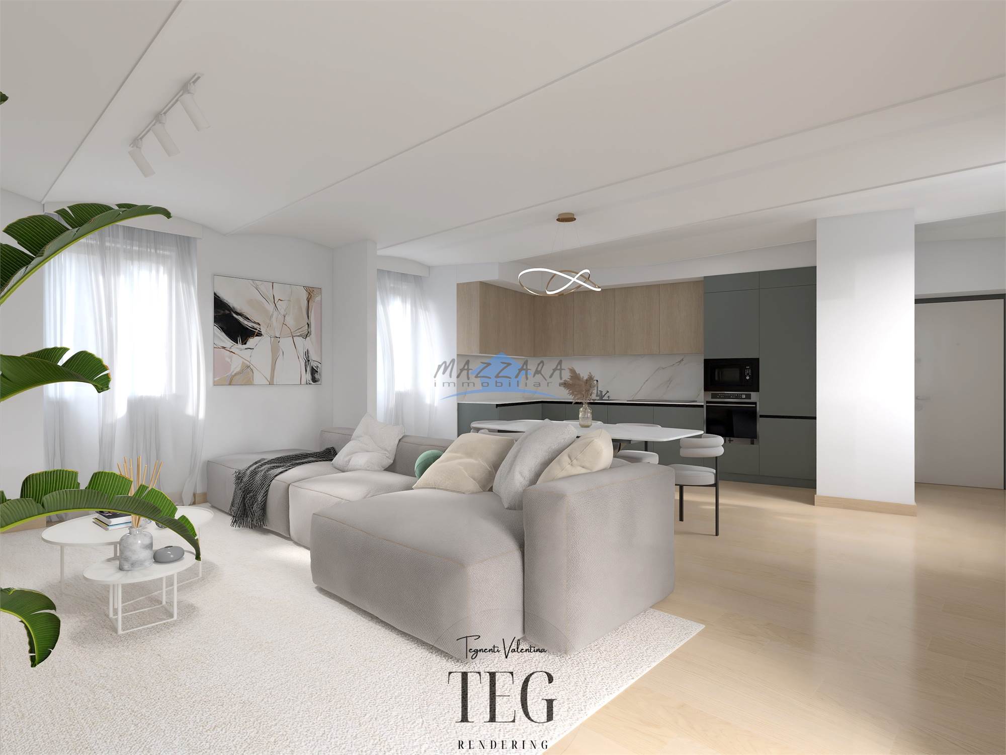 L’ingresso conduce alla luminosissima zona giorno con soggiorno e cucina a vista.