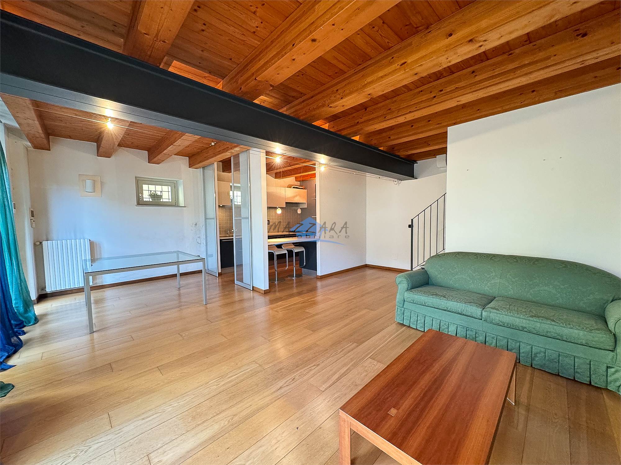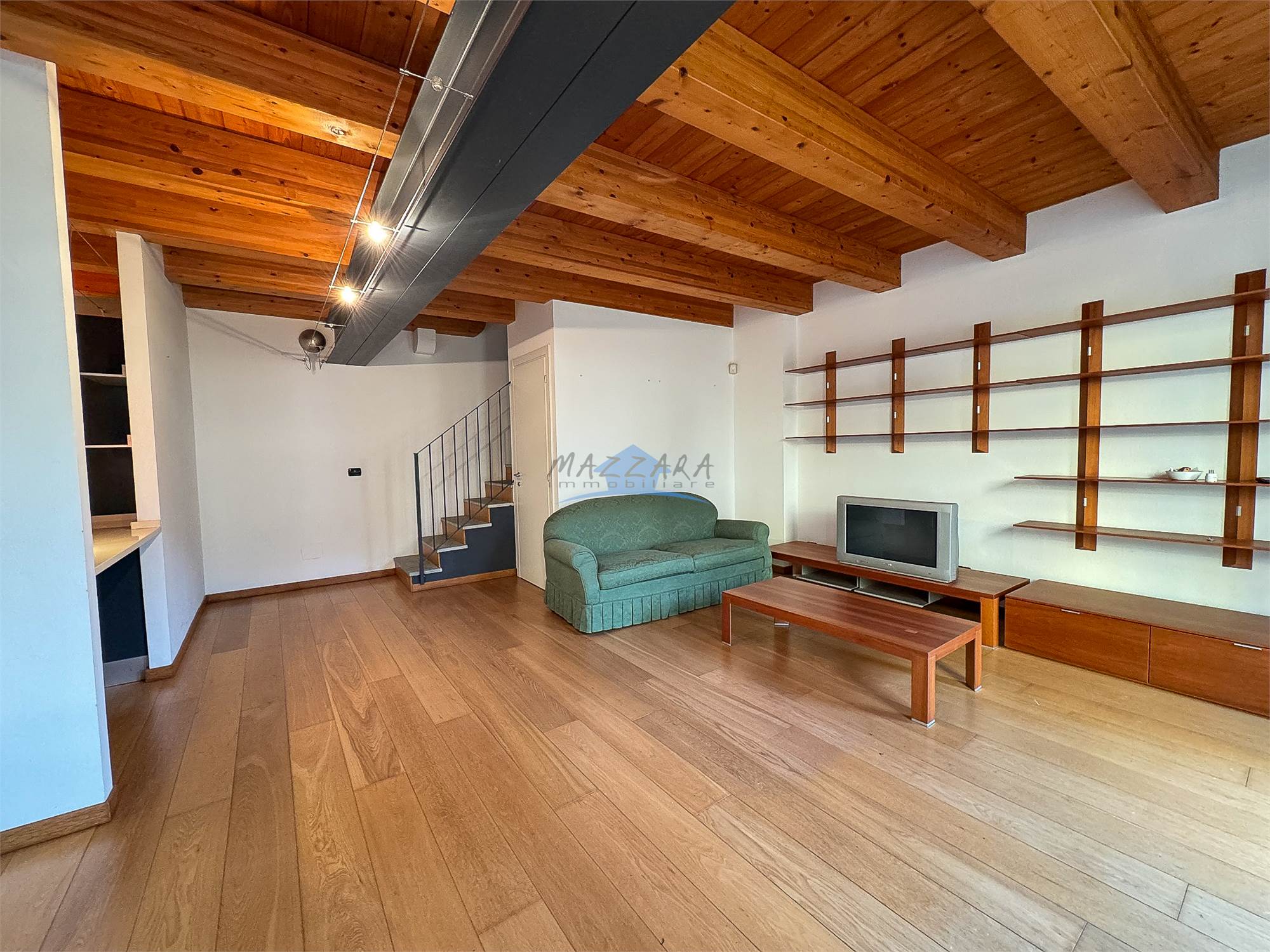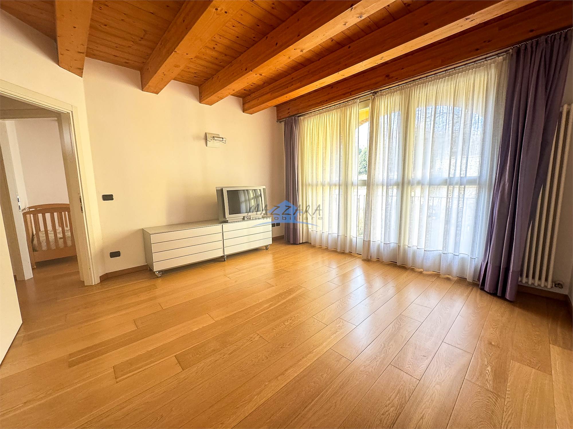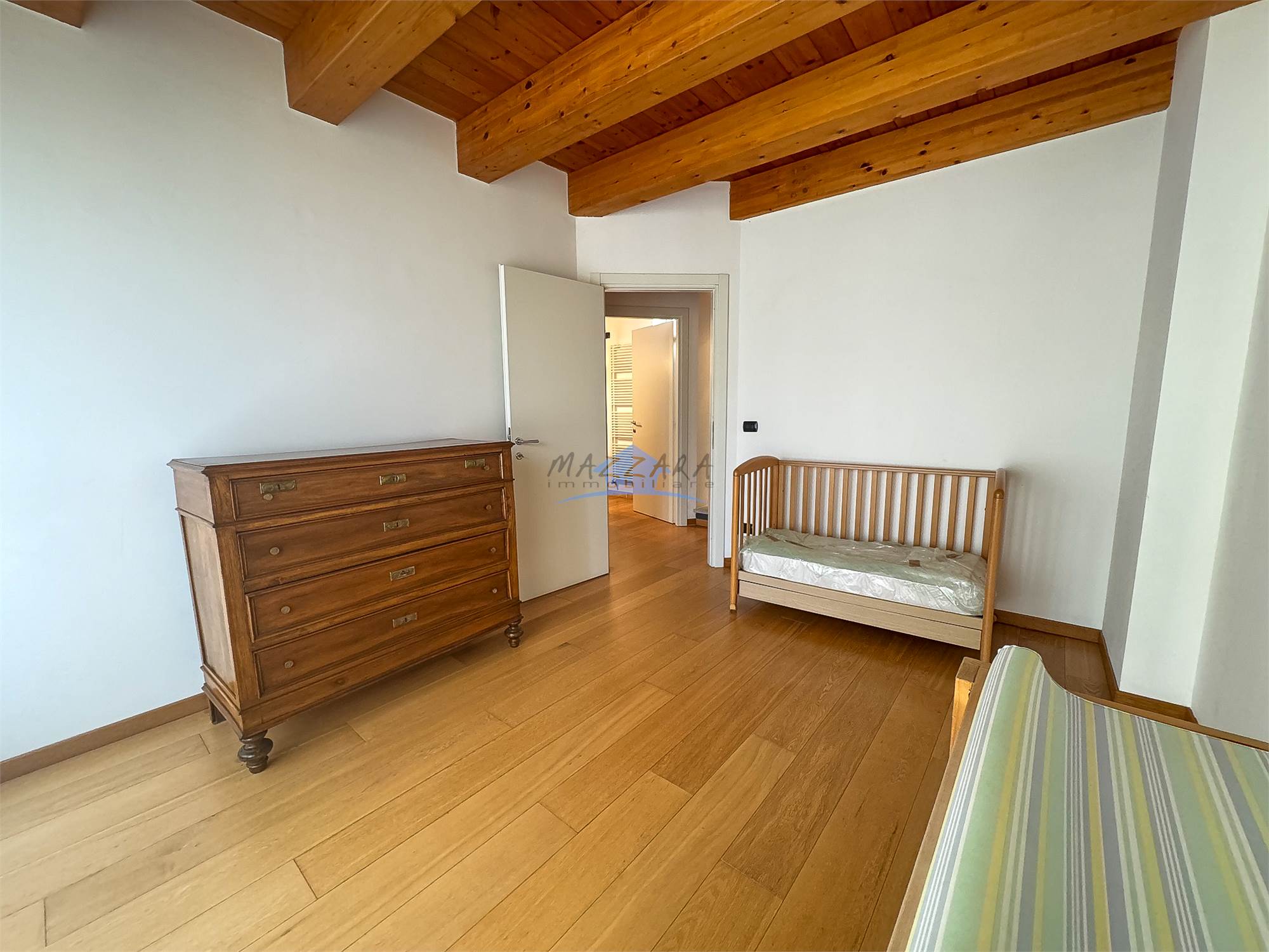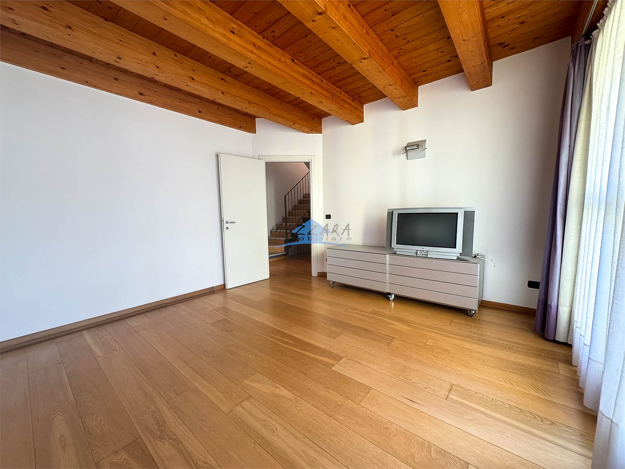 Locale unico di generose dimensioni, valorizzato dalle travi a vista, perfetto come terza camera, studio o area relax, completo di bagno e ripostiglio.