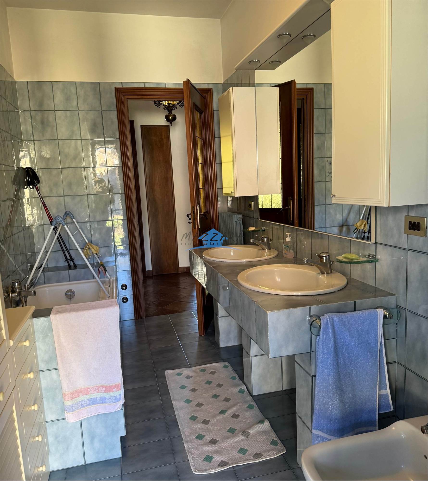 Al piano superiore un alloggio di crca 198 mq composto da: ingresso su ampio sogggiorno con camino,una cucina, una camera/studio, un disimpegno divide la zona giorno dalla zona notte dove troviamo 3 camere e 2 bagni ( vasca e doccia)